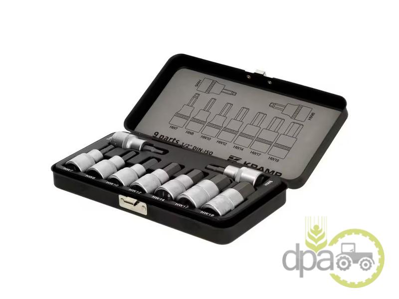 Set de capete chei tubulare profesionale cu profil hexagonal exterior, compus din 9 piese diferite, pentru suruburi cu cap tubular, fabricate din otel vanadium cromat. Livrat intr-o cutie de metal bine organizata, rezistenta si durabila.